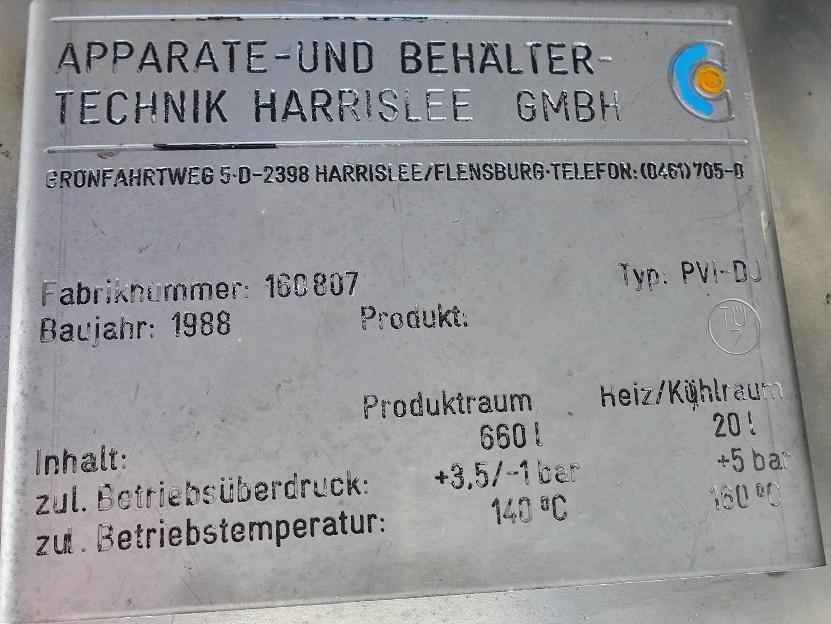 Pharmacy; According to the previous operator, the vessel's heating/cooling jacket is no longer functional; further technical documents available; we can’t give any guarantees about the agitator