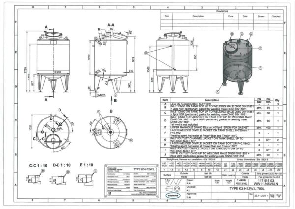 Fläns för omrörare: Nej Märkskylt: Ja Livsmedelsklassad: Ja med besiktning av: TUV Tankutlopp: inside Ø 50 mm Teknisk ritning finns: Ja Utloppstyp: DIN11851 male