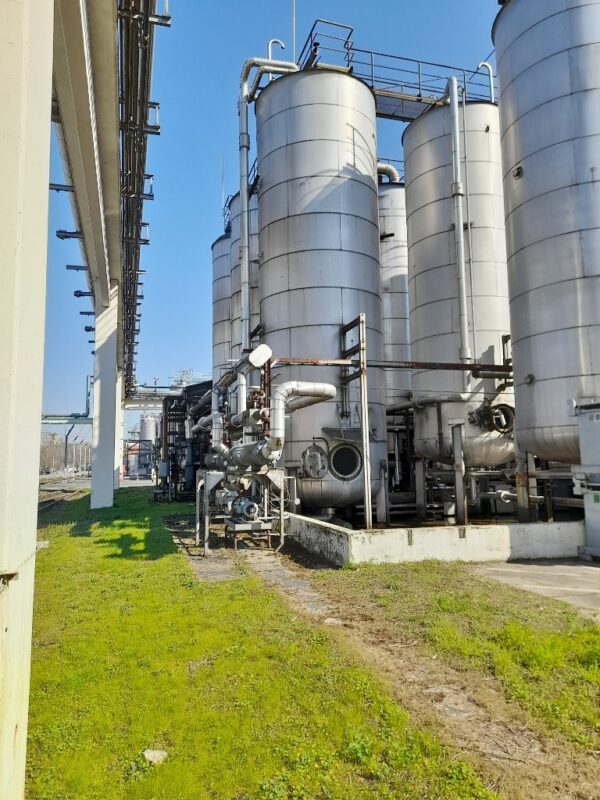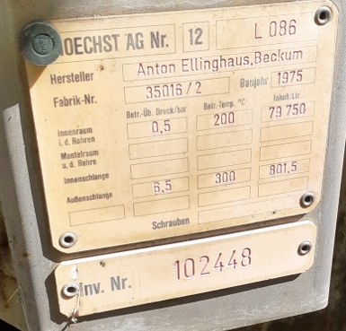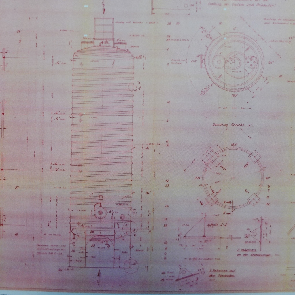 Chemistry; Wall thickness lower cylinder area: 6 mm; 1 manhole NW 500 in the lower cylinder area, 1 manhole NW 500 and NW 600 in the upper bottom; Stand frame, Fe; we can’t give any guarantees about