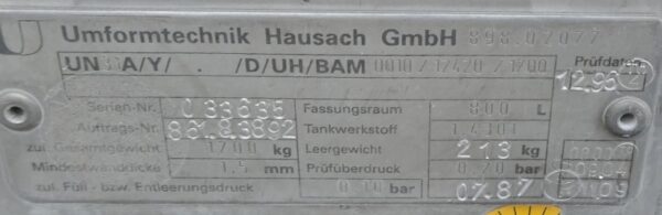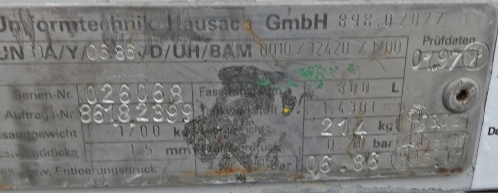 Chemistry (toluene); Frame Fe (galvanized; lacquered); according to the manufacturer, ADR test papers are available and, if required, can be requested there using the serial number; traces of usage