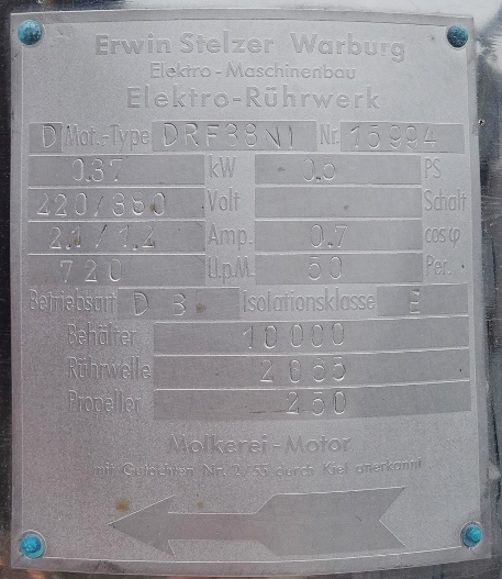 Dairy; 1 Manhole diameter appr. 500 mm in the front bottom; we can’t give any guarantees about the agitator