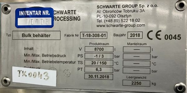 8700 liter tank i Rostfritt 304