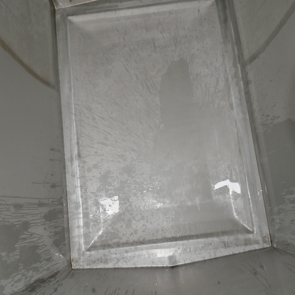 the outlet to DN 50 DIN 11851 (with butterfly valve)) and manhole seals were installed; walls curved outwards; small dents in the front bottom possible