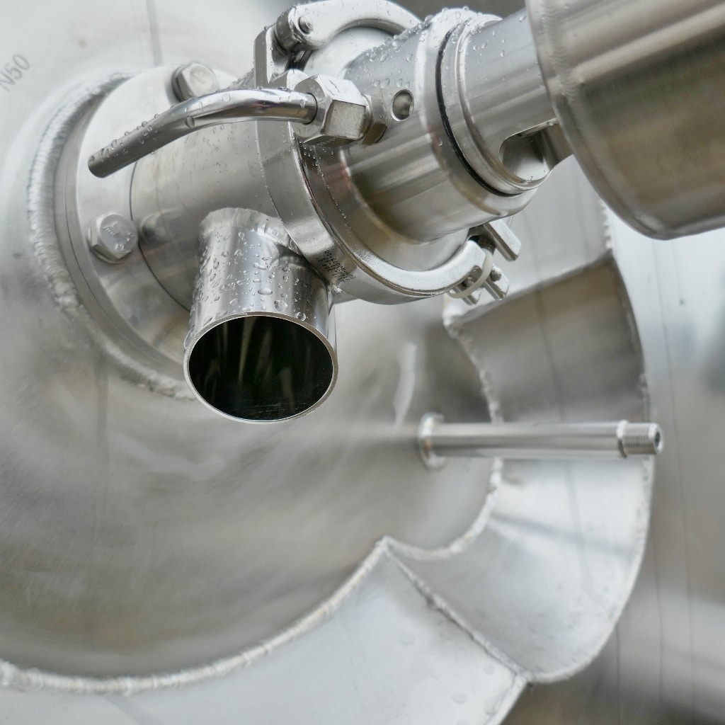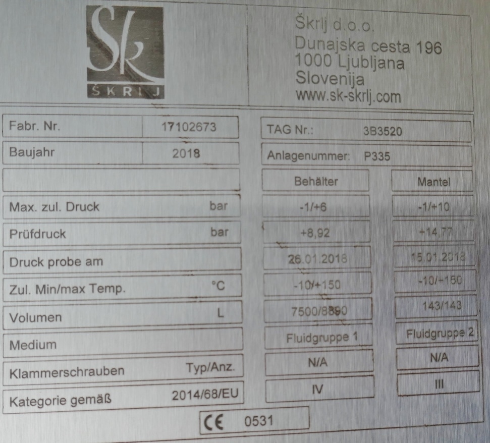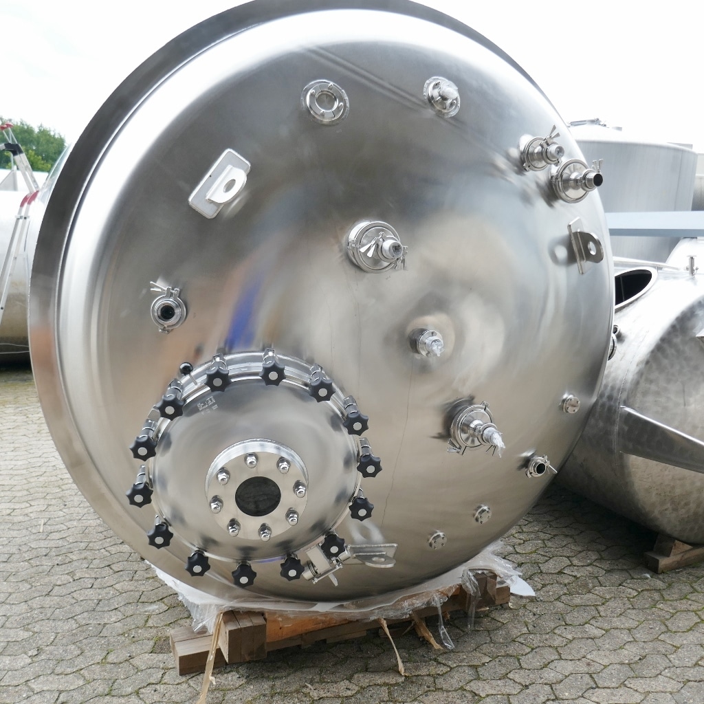 Tank was manufactured for a global pharmaceutical company but was never put into operation; Diameter of outlet (fitting) approx. 44 mm; we can’t give any guarantees about the heating/cooling jacket