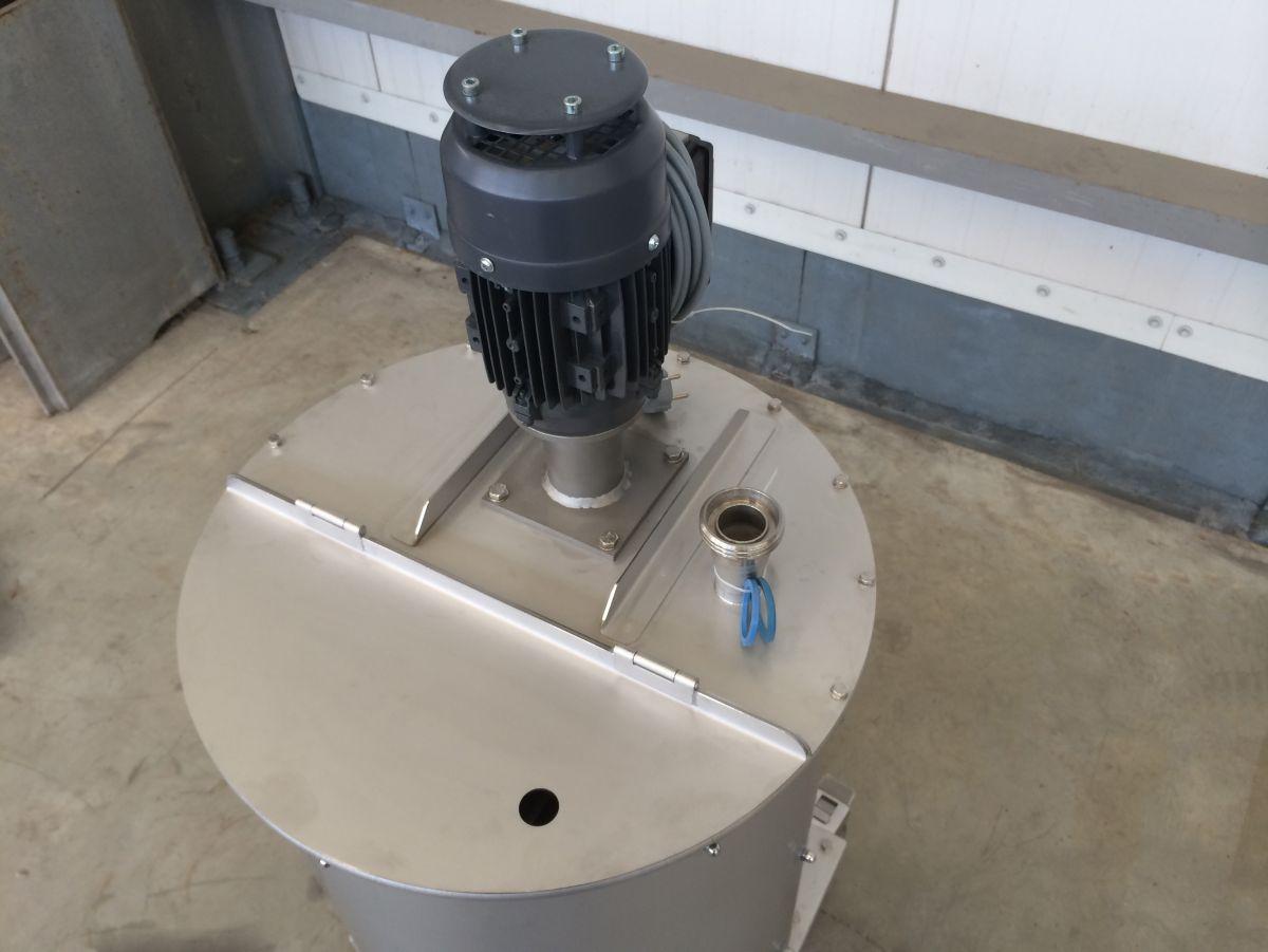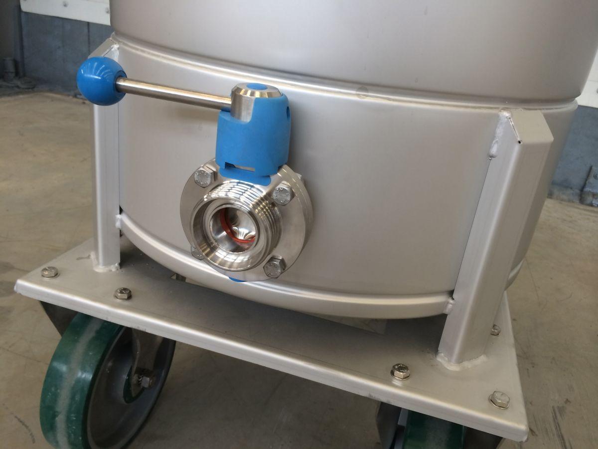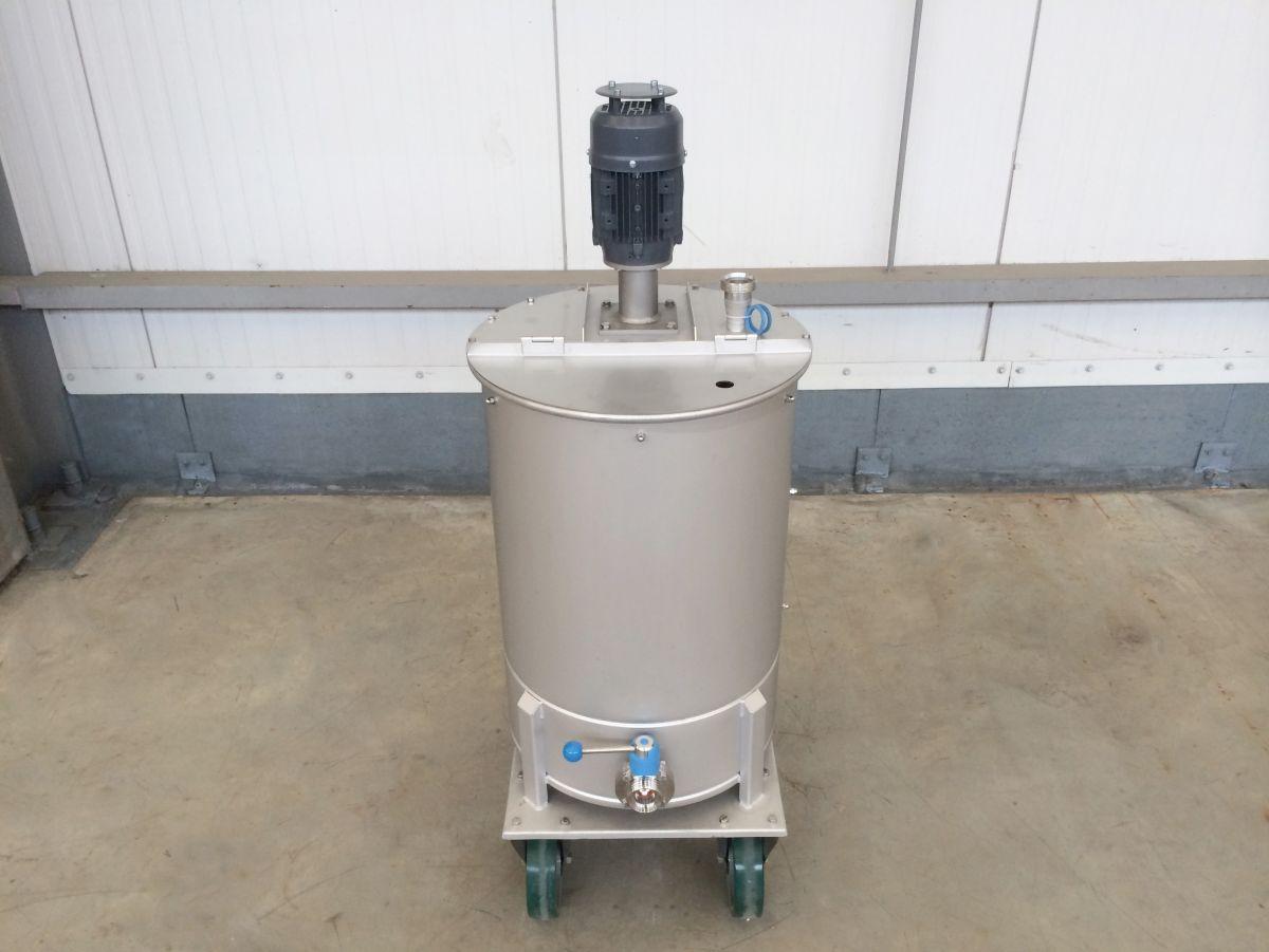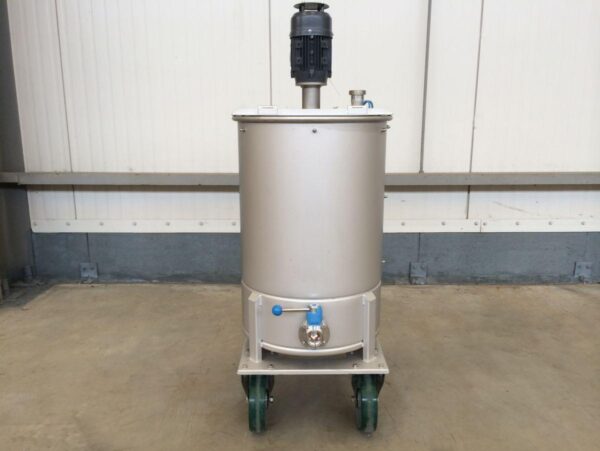 closed tank on 4 stainless wheels; propellor agitator in SS stainless-steel AISI 304 (V2A): 0,37 kW – 1.500 rpm; lantern ring in stainless-steel; discharge valve DIN11851; CIP sprayball 1/2; we