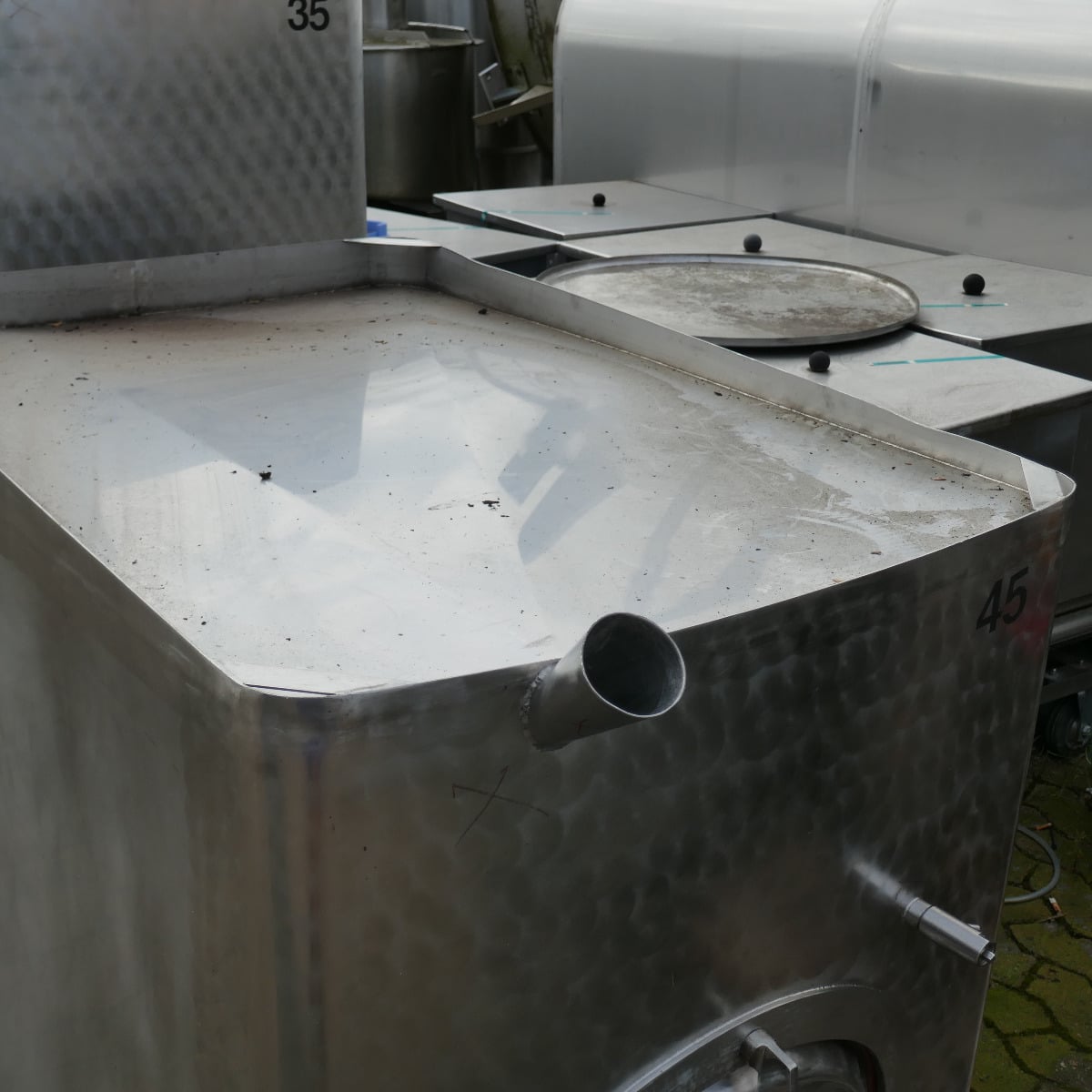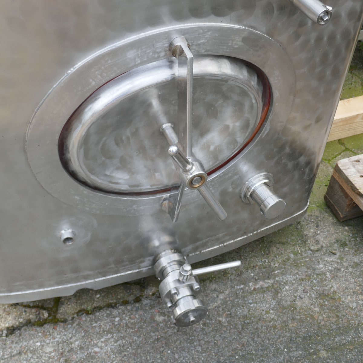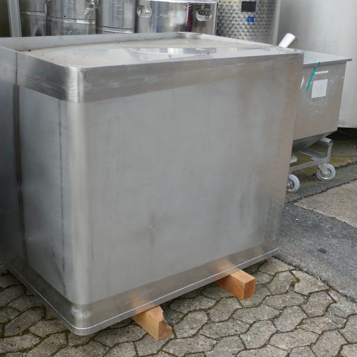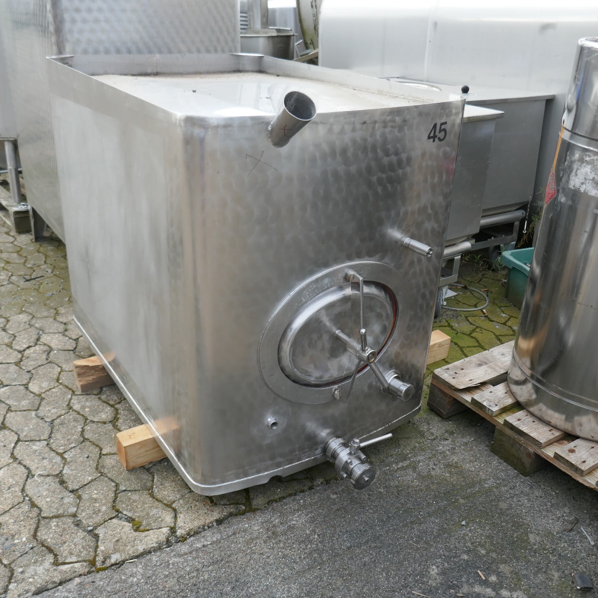 Wine storage; 1 manhole approx. 315 x 405 mm in the front bottom; basic dimensions inside approx. 1,210 x 830 mm; internal height approx. 900 mm; outlet fitting is slightly lower than the tank