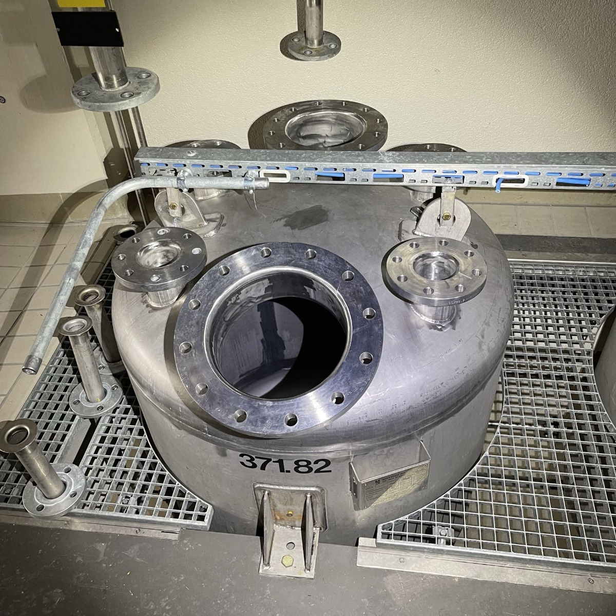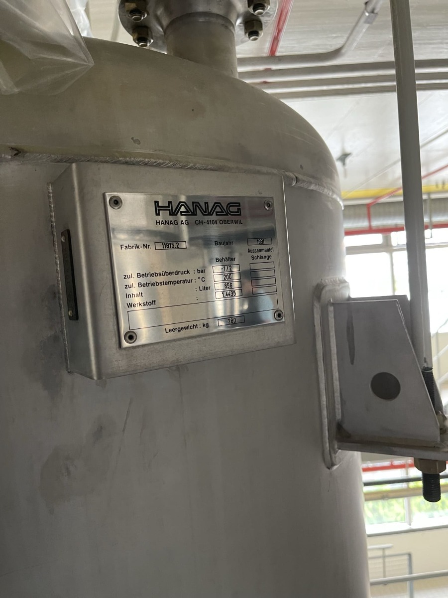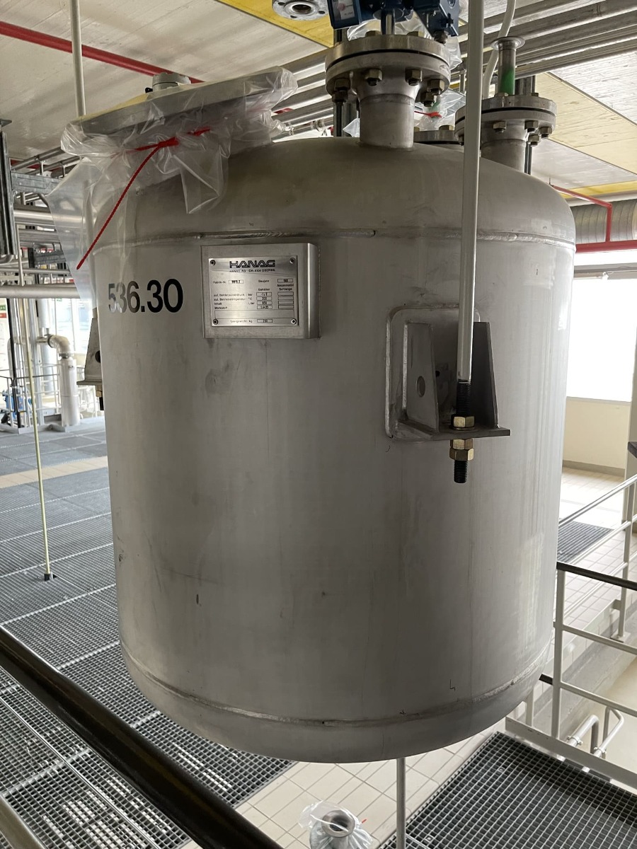 Pharmaceutical chemistry; Standard drawing available; 2 support brackets, stainless steel; 1 hand hole DN 250 in the upper bottom (hand hole cover mostly missing)