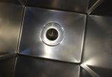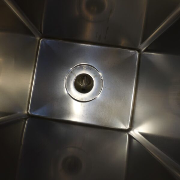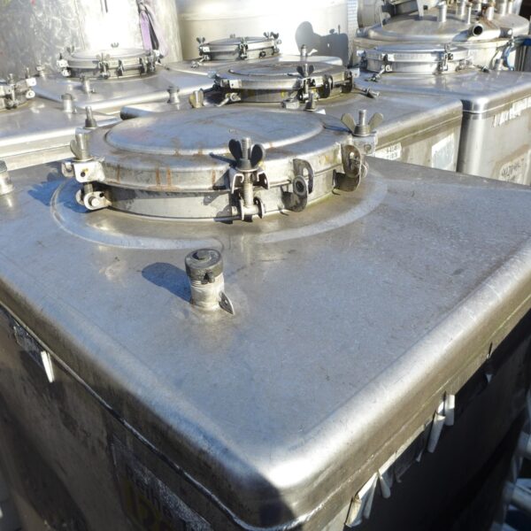 paint (chemistry); outlet DN80 with flanged EBRO-valve and screwed male tanker coupling; container built according to DIN6601 for flammable liquids; frame, Aisi 304; partially smaller dents; for 1